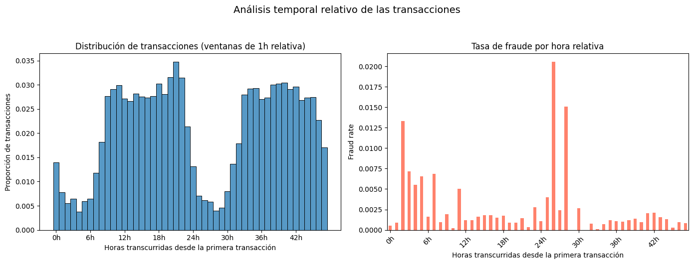 A través del análisis del tiempo, se puede notar que cuando hay menos transacciones es cuando hay más fraudes. Lo que me lleva a pensar que: en la madrugada hay menos transacciones por lo tanto, en la madrugada se da la mayor cantidad de fraudes. Pero solo es suposición.