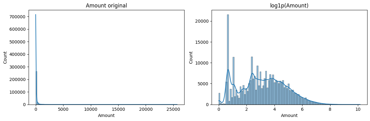 Amount suele estar muy sesgado a la derecha y con outliers. log1p: