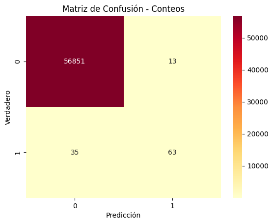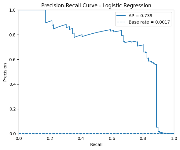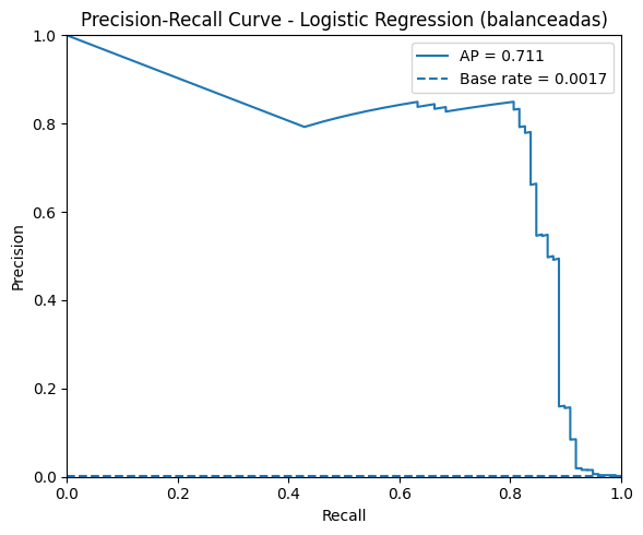 Los resultados de la regresión logística sin aplicar ninguna técnica de rebalanceo muestran, en primer lugar, una accuracy muy alta (0.9992), aunque esta métrica es poco informativa dado el fuerte desbalance de clases. Métricas más adecuadas, como la balanced accuracy (0.8213), evidencian que el modelo logra un rendimiento razonable en ambas clases, aunque con cierta asimetría. En cuanto al desempeño sobre la clase minoritaria (fraude), se observa una precisión alta (0.8289), lo que significa que la mayoría de las transacciones identificadas como fraudulentas realmente lo son, pero un recall más bajo (0.6429), indicando que aún se pierden una proporción importante de fraudes. Esto se refleja en un F1 de 0.7241, que resume el equilibrio entre precisión y recall. Finalmente, el ROC-AUC (0.9571) sugiere una buena capacidad general de discriminación, pero es el PR-AUC (0.7390) el que refleja mejor la dificultad del problema y confirma que, aunque el modelo es capaz de concentrar fraudes en sus predicciones, todavía queda margen de mejora en la detección de casos positivos.