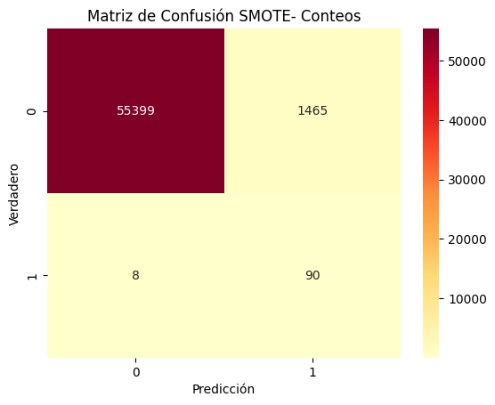 La implementación de SMOTE con la regresión logística muestra un comportamiento muy similar al caso con class_weight=balanced. La accuracy (0.9741) disminuye respecto al modelo sin rebalanceo, ya que ahora el modelo se enfoca en la clase minoritaria y deja de aprovechar la abundancia de negativos. En contraste, la balanced accuracy (0.9463) es mucho más alta y evidencia un desempeño equilibrado entre ambas clases. El modelo alcanza un recall elevado (0.9184), lo que significa que logra detectar la mayoría de los fraudes, pero a costa de una precisión muy baja (0.0579): la mayoría de las alertas son falsos positivos. Esto se refleja en un F1 bajo (0.1089), indicador de que la calidad de las predicciones positivas es limitada. Sin embargo, el ROC-AUC (0.9693) se mantiene alto y el PR-AUC (0.7220) confirma que el modelo logra concentrar los fraudes en los puntajes más altos. En conclusión, SMOTE permite mejorar la detección de fraudes (alto recall), pero introduce una gran cantidad de falsas alarmas, por lo que sería necesario ajustar umbrales o aplicar estrategias adicionales para mejorar la utilidad práctica del modelo.