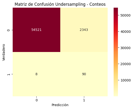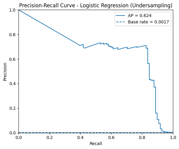 La regresión logística con undersampling muestra un desempeño distinto respecto a las otras estrategias de rebalanceo. La accuracy cae a 0.9587, lo cual es esperable ya que se reduce drásticamente la cantidad de ejemplos de la clase mayoritaria y el modelo deja de priorizar los “no fraudes”. Sin embargo, la balanced accuracy (0.9386) indica que logra un rendimiento bastante equilibrado entre ambas clases. El recall es muy alto (0.9184), mostrando que el modelo detecta la mayoría de los fraudes, pero la precisión es extremadamente baja (0.0370), lo que significa que la gran mayoría de las alertas son falsos positivos. Esto provoca que el F1 score se desplome hasta 0.0711, evidenciando una baja calidad de predicción sobre la clase positiva. A nivel global, el ROC-AUC (0.9764) se mantiene alto, aunque el PR-AUC (0.6244) disminuye respecto a SMOTE y class_weight=balanced, reflejando que el modelo no logra concentrar de manera tan efectiva los fraudes en las primeras posiciones. En conclusión, aunque el undersampling logra un excelente recall, la pérdida de información de la clase mayoritaria deteriora la precisión y limita la utilidad práctica del modelo.