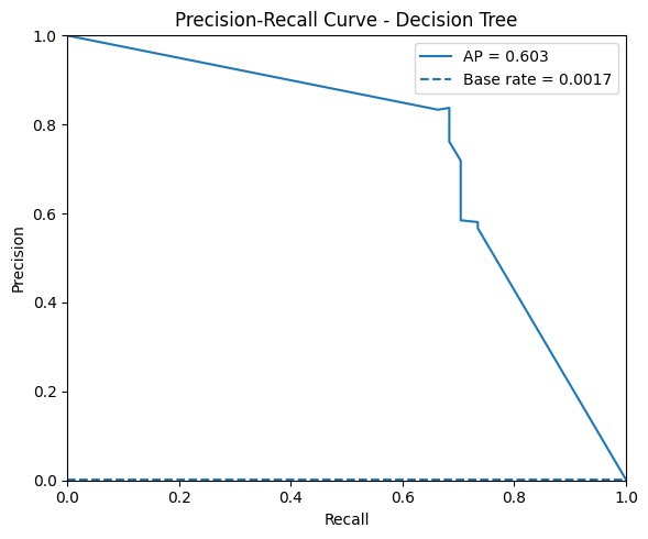 Los resultados obtenidos con el árbol de decisión muestran que, aunque el modelo logra una accuracy elevada (0.9986), este valor está influenciado por el fuerte desbalance del dataset y no refleja de manera justa su rendimiento. Al observar métricas más adecuadas, se aprecia una balanced accuracy de 0.8669, lo que indica un desempeño aceptable en ambas clases. El modelo alcanza una precisión moderada (0.5669), es decir, poco más de la mitad de las transacciones clasificadas como fraude son correctas, y un recall de 0.7347, lo que significa que detecta alrededor de tres cuartas partes de los fraudes. El F1 (0.64) refleja un equilibrio razonable entre precisión y recall, aunque lejos de ser óptimo. Sin embargo, el ROC-AUC (0.8671) y especialmente el PR-AUC (0.6027) muestran que el árbol de decisión tiene limitaciones claras para concentrar efectivamente los fraudes.