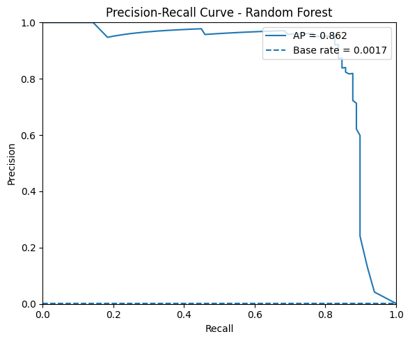 Los resultados obtenidos con el Random Forest evidencian una mejora sustancial respecto al árbol de decisión individual. La accuracy alcanza 0.9995, aunque, como en modelos anteriores, esta métrica es poco informativa en un contexto tan desbalanceado. Más relevante es la balanced accuracy (0.8826), que indica un rendimiento equilibrado en ambas clases. El modelo logra una precisión muy alta (0.9615), lo que significa que casi todas las transacciones señaladas como fraude efectivamente lo son, y mantiene un recall de 0.7653, detectando más de tres cuartas partes de los fraudes. Este balance se refleja en un F1 de 0.8523, significativamente superior al del árbol de decisión. Además, tanto el ROC-AUC (0.9676) como el PR-AUC (0.8622) confirman la capacidad del Random Forest para discriminar fraudes y concentrarlos en las predicciones con mayor probabilidad. El Random Forest se presenta como un modelo mucho más robusto y eficaz para la detección de fraudes, reduciendo falsos positivos y maximizando la utilidad práctica frente a las alternativas más simples.