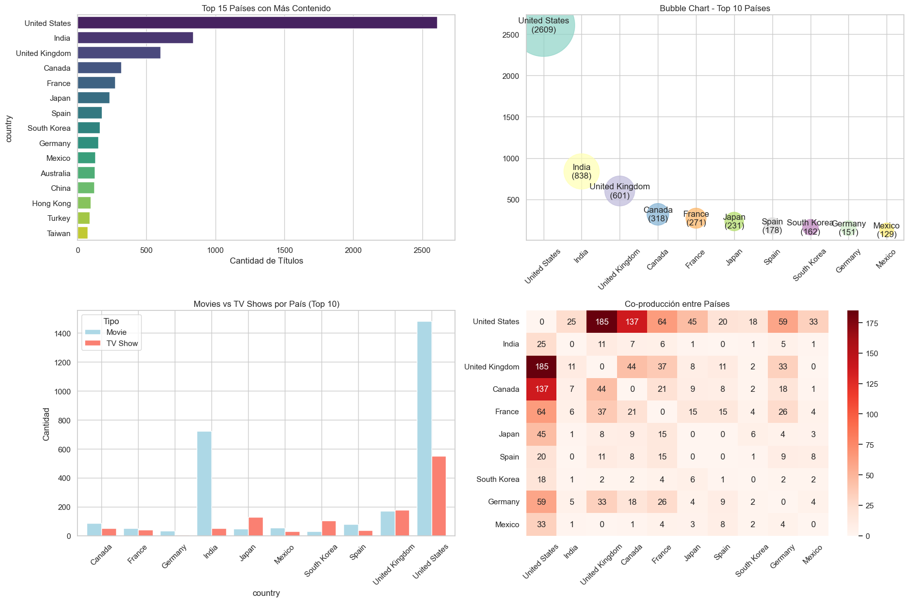 - Decisiones de visualización: line plot para continuidad temporal (tendencias), barplot para categorías (país/ratings/géneros) y heatmaps para co-ocurrencias.