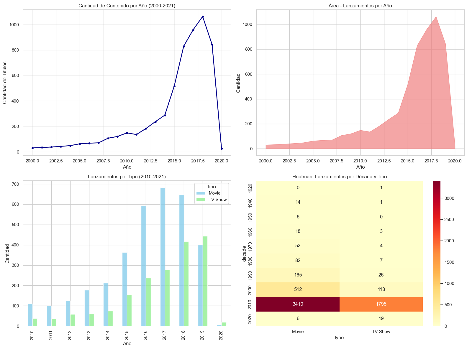 title,release_year) o ID canónico. - Evitar gráficos redundantes (pie + donut del mismo dato); priorizar el más legible.