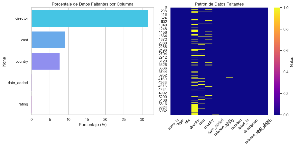 directorcontiene un 31.6% de datos faltantes.castcontiene un 9.1% de datos faltantes.countrycontiene un 7.6%.date_added0.18% yrating0.16%.