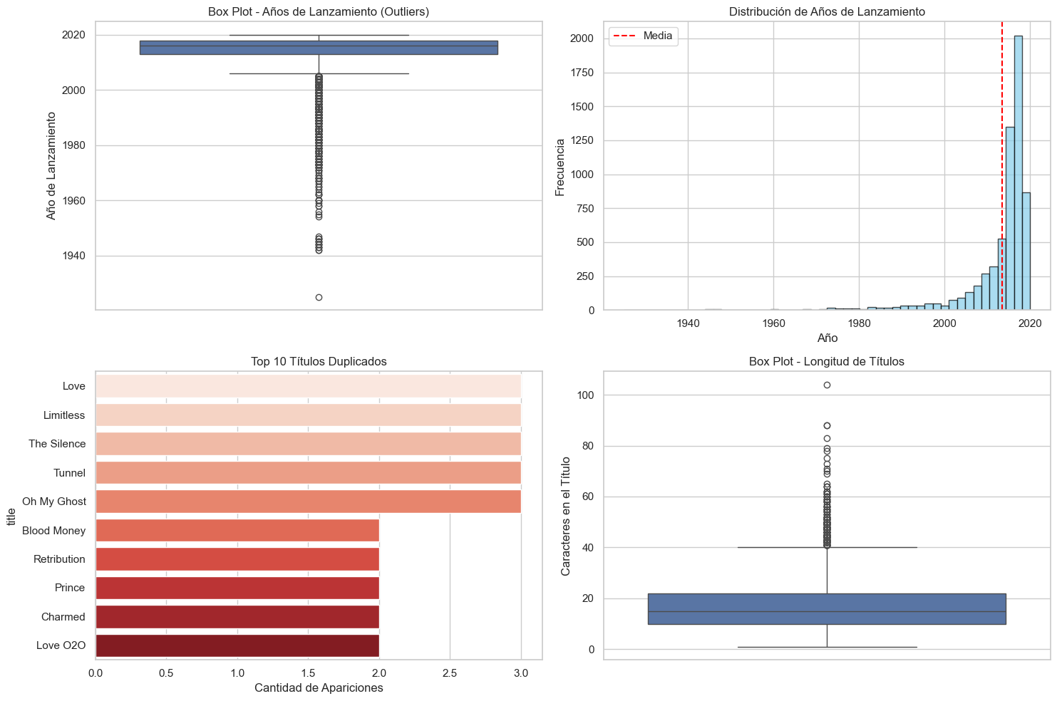missing = netflix.isna().sum().sort_values(ascending=False) missing_pct = (netflix.isna().sum()/len(netflix)*100).sort_values(ascending=False) missing[missing>0], missing_pct[missing_pct>0] - Outliers / duplicados / títulos extremos