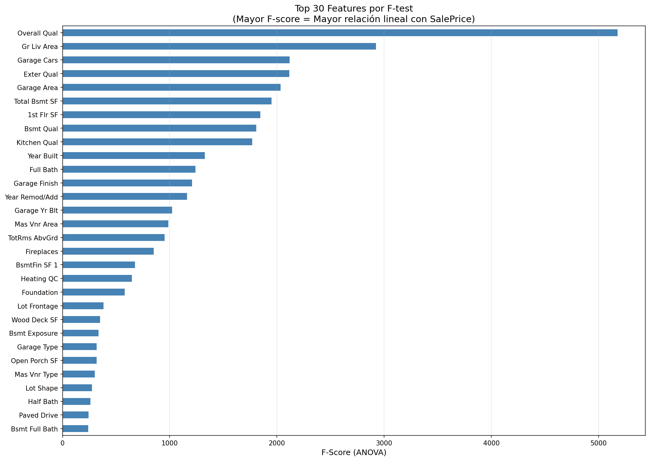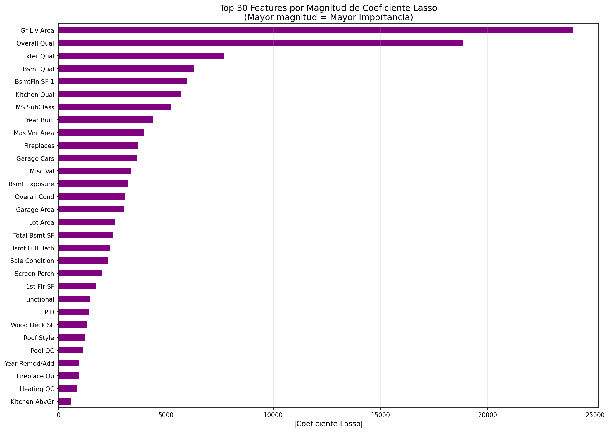 Lasso Shrinkage: Si Lasso eliminó 40 de 81 features (forzó a coeficiente 0), indica redundancia fuerte y estructura lineal subyacente; el dataset es altamente colineal. Esto guía decisiones de encoding, combinación de variables y viabilidad de modelos más simples.