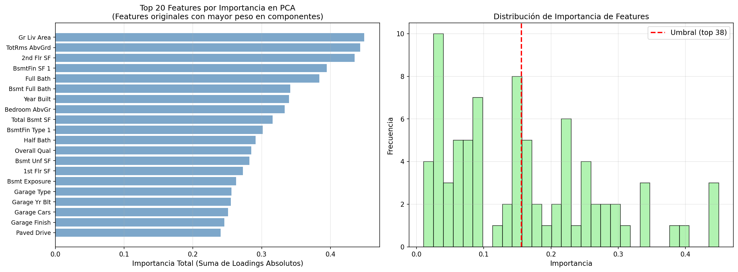 Interpretabilidad: PC1 captura la variabilidad más relevante del dataset; en bienes raíces, representa combinaciones lineales de tamaño, calidad y ubicación. Para un agente inmobiliario, esto es poco útil porque no puede explicar al cliente por qué su casa vale X basándose en un número abstracto.