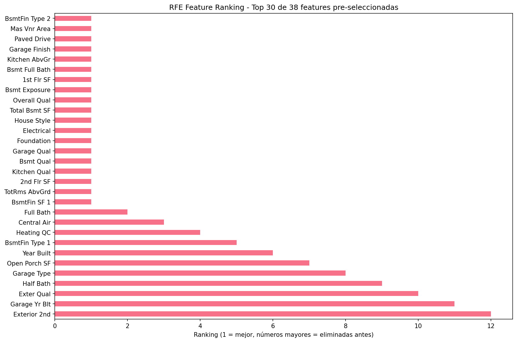 Features redundantes: Entre GarageArea y GarageCars correlacionadas, elimino la más débil según importance y contexto; en este caso, mantengo GarageArea por continuidad. Si ambas aportan, conservo las dos hasta validar pérdida de precisión.