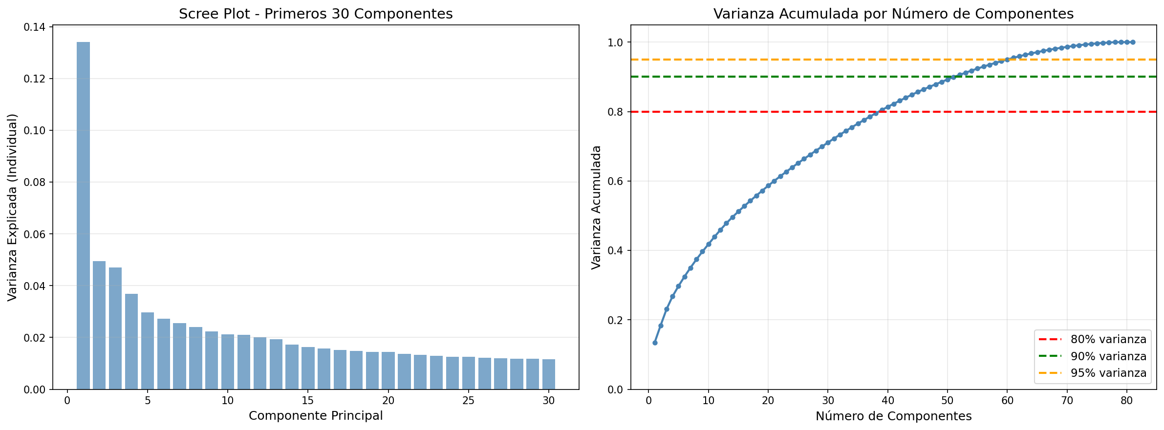 Decisión: Se utilizaron 38 componentes (80% varianza) para balancear reducción dimensional con retención de información.