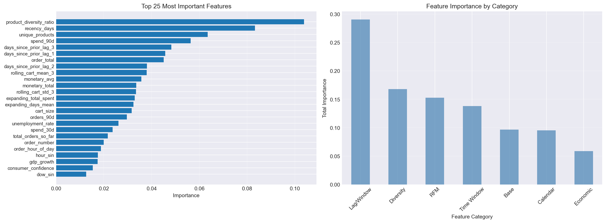 Lag y window features capturan patrones de comportamiento: Las features de lag y ventanas móviles fueron las más importantes (29% del total), demostrando que el comportamiento histórico es clave para predecir recompra.