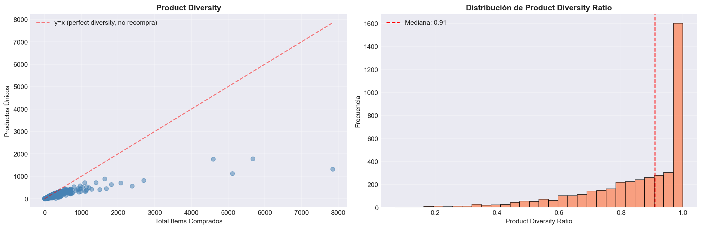 - Ratio alto (~1.0): Usuario explora productos variados (alta diversidad, no recompra)