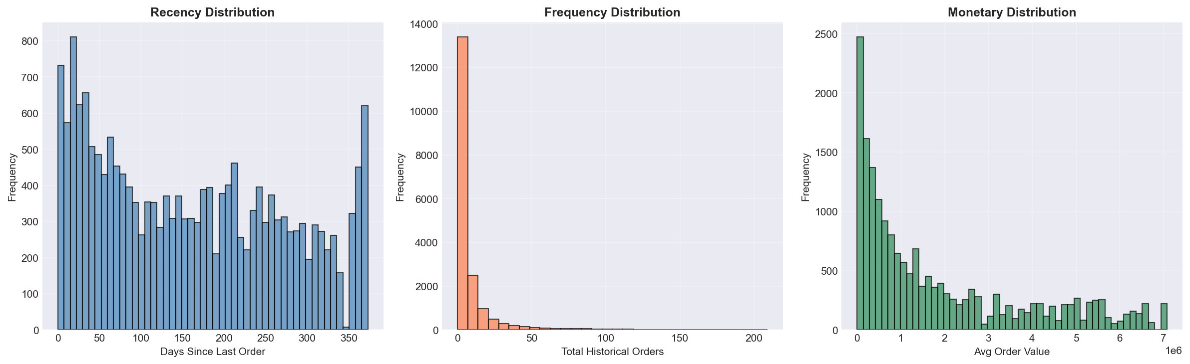 recency_days: días desde la última comprafrequency_total_orders: número total de órdenes del usuariomonetary_avg: gasto promedio por ordenmonetary_total: gasto total acumulado