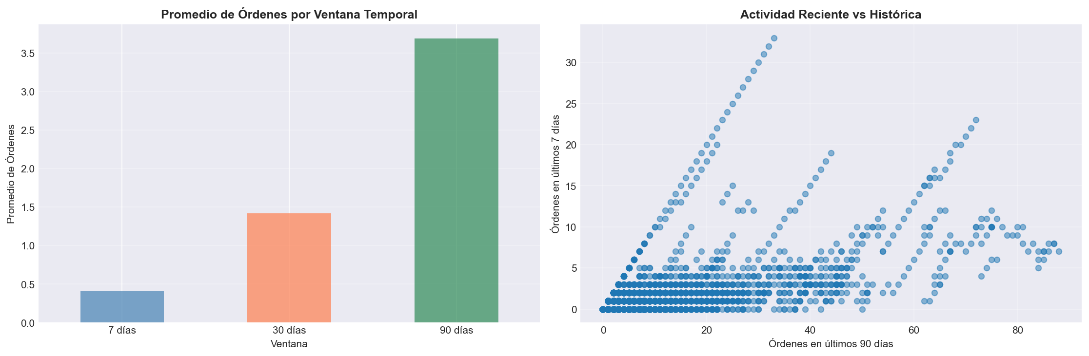 Insight: Las ventanas móviles capturan tendencias recientes del comportamiento del usuario, permitiendo detectar cambios en patrones de compra.